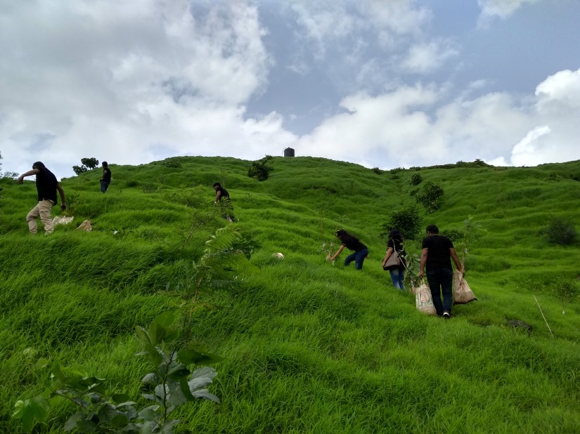 It was a ten minute walk from the parking spot to the base of the hill where we were handed over our pre-numbered saplings in bags to be carried to the allocated spots. This entails a small trek up the hill with the laborers to guide us to the spot and help with the planting. It was like one of those patriotic/ motivational movie scenes what with encouraging one another with the ‘chale chalo’ and ‘lakshya toh, har haal mein paana hai’ chants to reach the top! Finally at our spots, we set the saplings in it and covered them up with the loose mud scattered around and the final touches were made by those laborers. Mission accomplished.