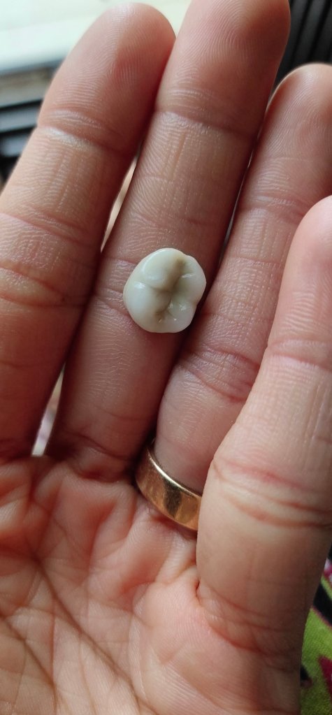 As he was explaining to me the post-surgery recovery procedure, I took out of my pocket the cap of tooth 3 that I was carrying around like a souvenir! Ta-da!!