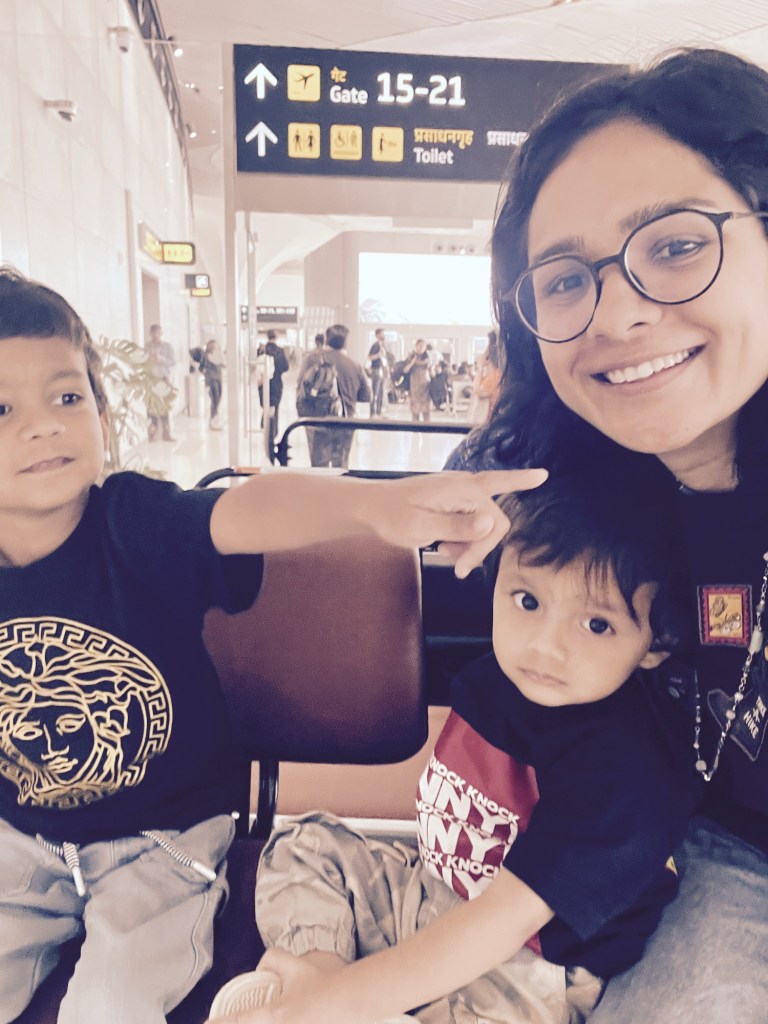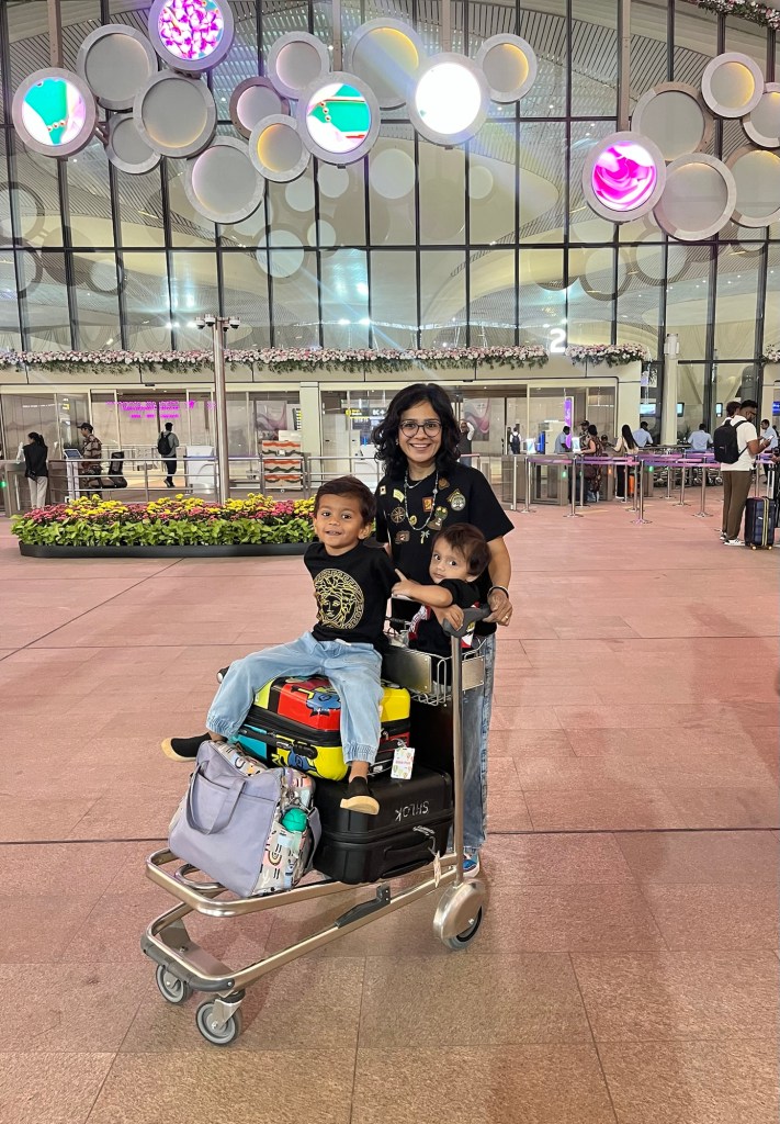Since I had done my web check-in, we reached the airport at the eleventh hour in true Patil style because there needs to be some advantage when you stay close to an airport, right?! I hadn’t found time to complete the DigiYatra process for the boys, so I had to stand in a queue to enter. When it was our turn, I bumped the cart into the closed gates because I couldn’t brake on time, what with the two kids perched atop the luggage! While the officer exclaimed, “MADAM!,” let me tell you, my clumsiness no longer embarrasses me.